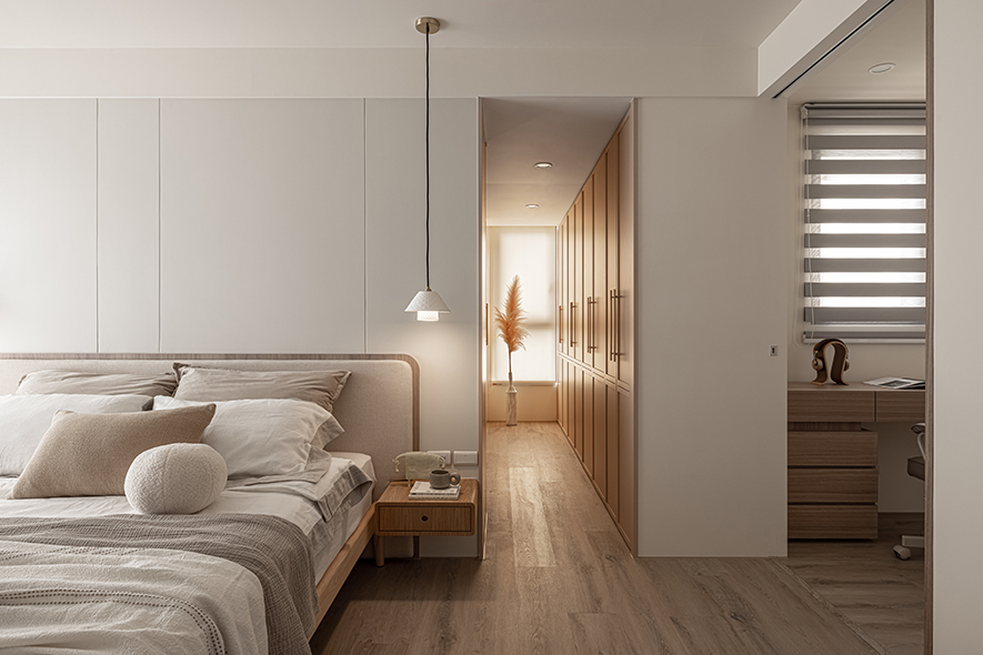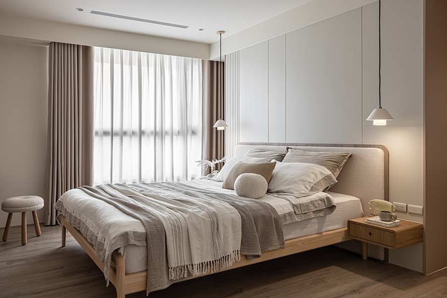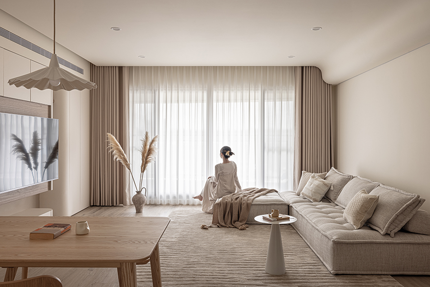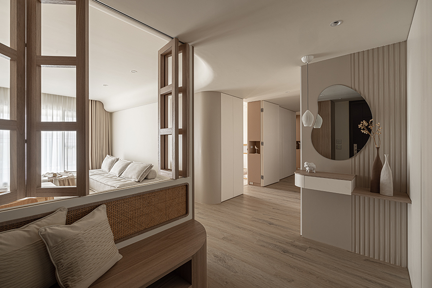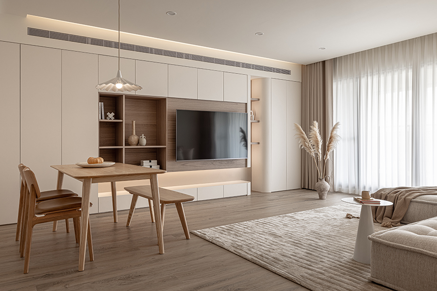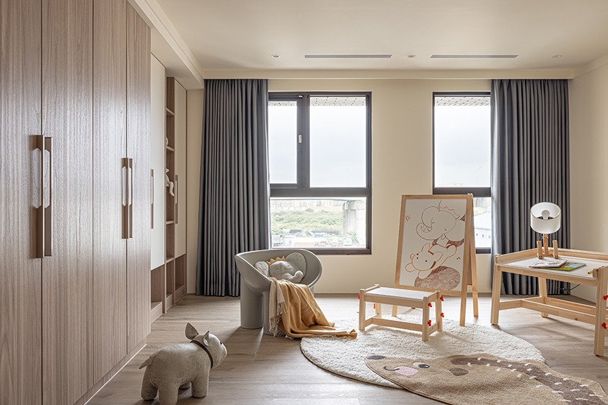 行步所至之處,蕩漾曲線輕巧串連「簡約」、「乾淨」、「低彩度」三項特色,悄然消弭天壁橫梁,搭襯同色系質感軟裝,醞釀出韓系獨有的知性氣質,令家宅彷彿覆上一層唯美濾鏡,觸目皆柔軟、細膩,溫柔包覆一家三口的天倫日常。