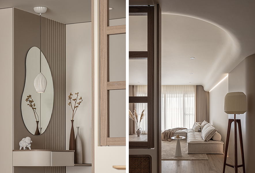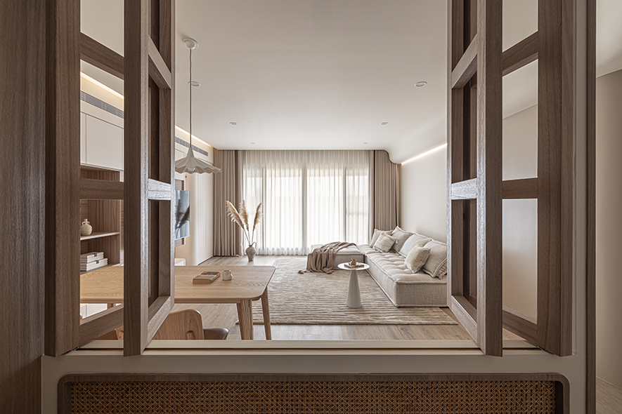 自玄關望入敞開的木格窗,柔美爛漫的淡彩旋即映入眼簾,屋裡一派明亮簡約,流溢奶茶色調的醇厚芬芳。四十多坪的宅邸中,喬治黑羊設計團隊 汲取現代風格的簡約精神,以溫潤色彩揉合藤編及木紋,交織出女主人嚮往的韓系風貌,使人徜徉於通透無壓的純淨寓所,少一分都市生活的繁忙拘謹,多一分平實日常的歲月靜好。