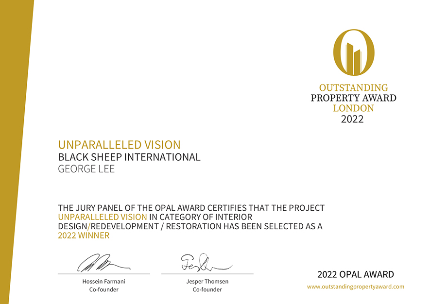 OUTSTANDING PROPERTY AWARD LONDON,OPAL(英國倫敦傑出地產大獎)由全球知名企業集團Farmani Group組織,並以招攬全球最佳建築師、室內設計師與房地產開發商為目標,在創造異業菁英聯合平台的同時,找尋各地最富創造力、革新感、社會影響力與永續性的設計方案。參與者有機會替自己最新穎的企劃,博得國際能見度,並且和產業的先驅及專業人士進行交流。
